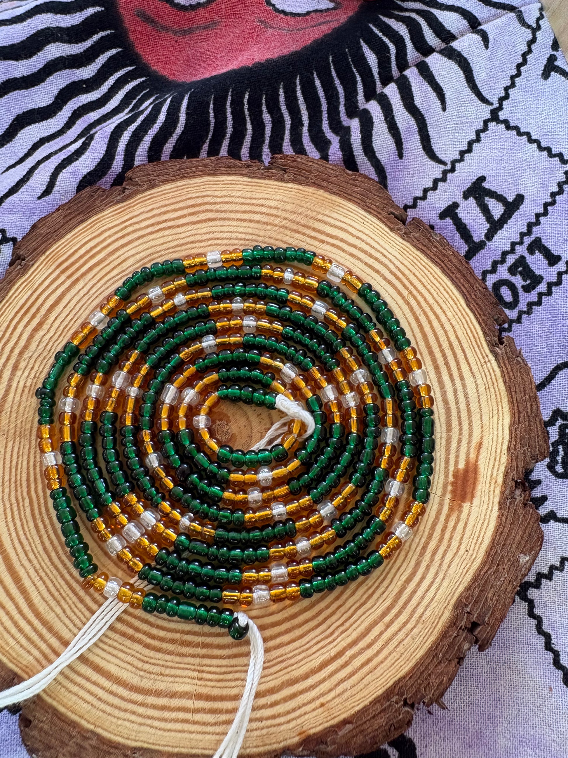 A lush strand of emerald green, gold, and clear beads, inspired by the wisdom and abundance of the earth. Golden Grove channels prosperity, stability, and renewal β€” reminding you that growth is a sacred process. It’s the perfect strand for grounding your intentions and manifesting abundance from the heart.